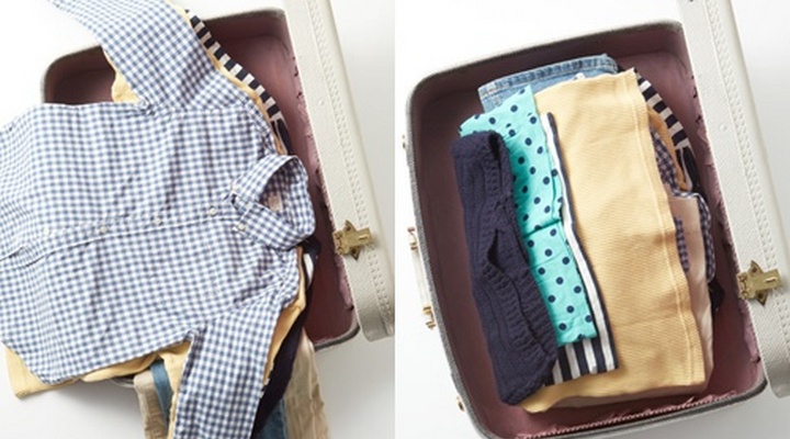 Salah satu cara efektif mengemas pakaian untuk traveling adalah melipat dan menyusun pakaian secara vertikal dalam koper.