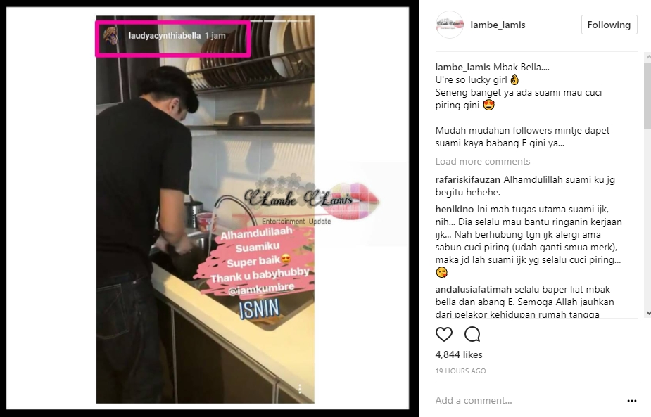 Dalam postingan yang diunggah dalam akun gosip @lambe_lamis itu, tampak Engku Emran tengah serius membasuh peralatan makan. Tak ingin menyia-nyiakan momen itu, Bella pun mengabadikannya melalui postingan di Instagram Story miliknya.