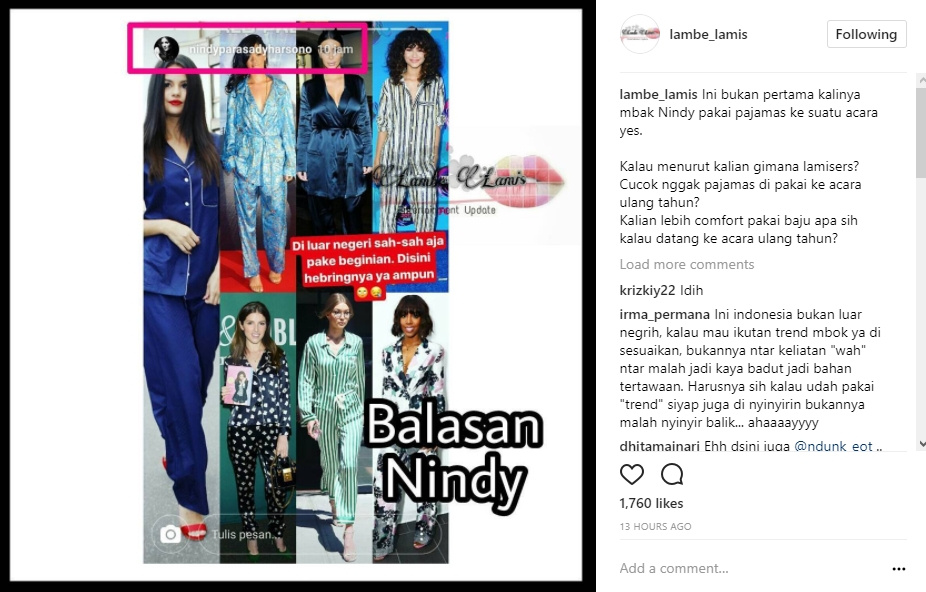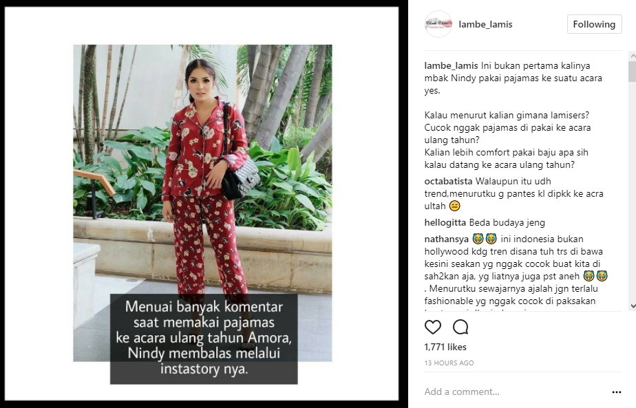 Mendapati berbagai komentar nyinyir yang dirasa cukup mengganggu, Nindy pun merasa heran. Pasalnya, Nindy menilai, masyarakat Tanah Air terlalu berlebihan dalam menilai pakaiannya, tak seperti saat di luar negeri. "Di luar negeri sah-sah aja pake beginian. Disini hebringnya ya ampun," tulis Nindy sambil menambahkan beberapa gambar model luar negeri yang mengenakan piyama saat di panggung.