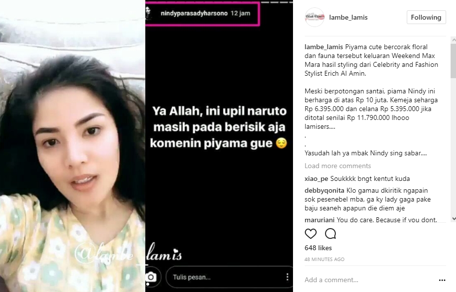 Tak berhenti sampai di situ, Nindy pun masih menanggapi soal komentar netizen yang terus saja membanjiri laman Instagramnya. "Terus buat para upil-upil naruto, bro and sist, makasih loh, komen-komennya. Pusing sendiri, ribut sendiri. Lucu ya kalian," kata Nindy.