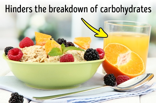 Sereal yang dikombinasikan dengan jus jeruk biasanya jadi menu sarapan pagi hari. Hal ini tidak akan membawa dorongan energi seperti yang kamu harapkan, melainkan bisa menyebabkan ketidaknyamanan di perut. Asam dalam jus jeruk secara drastis menurunkan aktivitas enzim yang bertanggung jawab untuk menghancurkan karbohidrat. Untuk alasan yang sama, tidak disarankan untuk menggabungkan biji-bijian dengan buah asam lainnya.