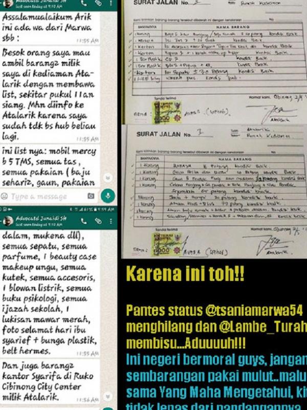 Kasus perceraian kedua selebritis itu semakin keruh usai Marwa membagikan postingan melalui akun Instagram yang berisi curahan hatinya. Marwa merasa geram yang mengetahui beberapa barang ditempatkan di kantong sampah. Bahkan, karena nomor poselnya di blokir oleh Atalarik, keputusan terakhir Marwa adalah memposting hal tersebut melalui media sosial.