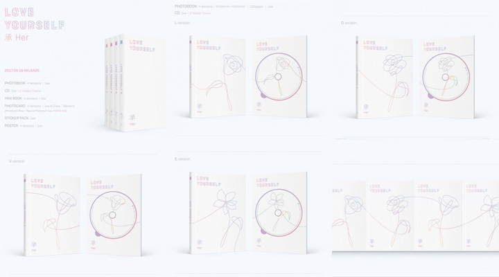 Ketujuh idol tampan itu memutuskan untuk mempercantik mini album comeback mereka dengan nuansa bunga yang sederhana namun tampak sangat artistik. Mini album bertajuk "Love Yourself: Her" ini akan dirilis dengan dalam 4 versi, yaitu versi "L", "O", "V", "E".