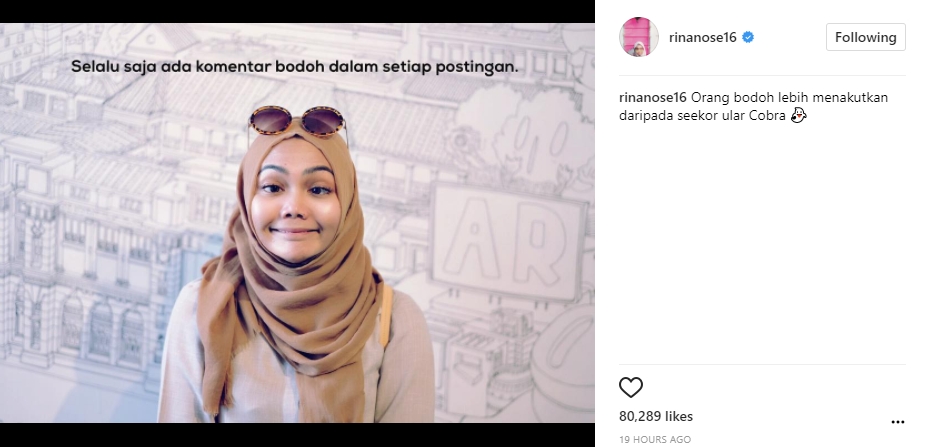 Seolah melontarkan kekesalannya, Rina Nose juga menyebutkan bahwa "orang bodoh" yang dimaksudnya itu menakutkan. "Orang bodoh lebih menakutkan daripada seekor ular Cobra," tulis Rina dalam caption postingannya.