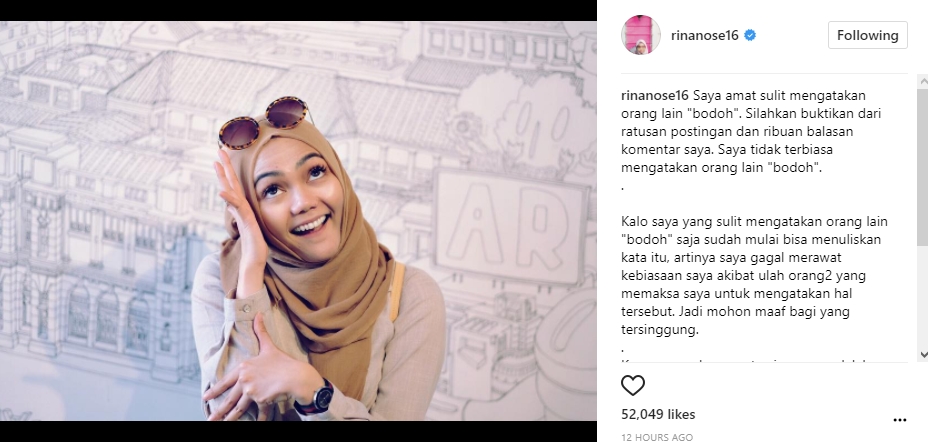 Tampaknya, pernyataan Rina itu seakan berisi soal sindiran. "Karena mereka yang tersinggung adalah mereka yang marah ketika dikatakan bodoh. Padahal orang pintar tidak marah ketika dikatakan bodoh😁✌️," lanjutnya.