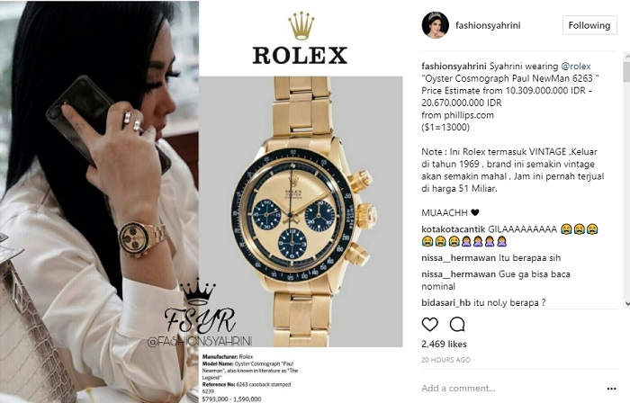 Menurut akun yang membahas segala sesuatu tentang Syahrini itu, koleksi jam tangan milik sang pelantun "Sesuatu" sudah diproduksi di tahun 1969. Tak heran, jika harga yang melekat di jam tangan tersebut sangat mahal. Semakin lama tahun produksi jam tangan dengan merek itu, maka harganya akan semakin melejit naik. "Note : Ini Rolex termasuk VINTAGE ,Keluar di tahun 1969 , brand ini semakin vintage akan semakin mahal , Jam ini pernah terjual di harga 51 Miliar," imbuh akun @fashionsyahrini.