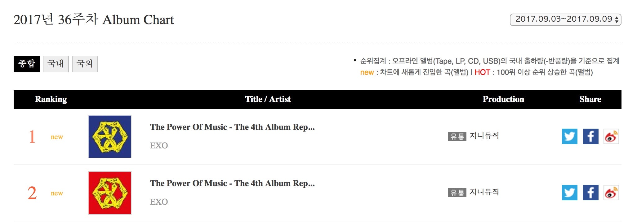 Kanal247.com - Sang "Quadruple Million Seller" EXO terus menunjukkan kekuatan mereka dengan album repackage "The War: The Power of Music". Dua versi dari dari album yang dirilis pada tanggal 5 September itu telah menempati dua peringkat teratas di chart penjualan album gabungan Gaon untuk minggu ke-36 tahun 2017 (3-9 September).