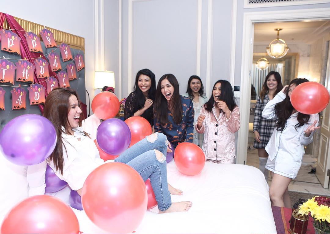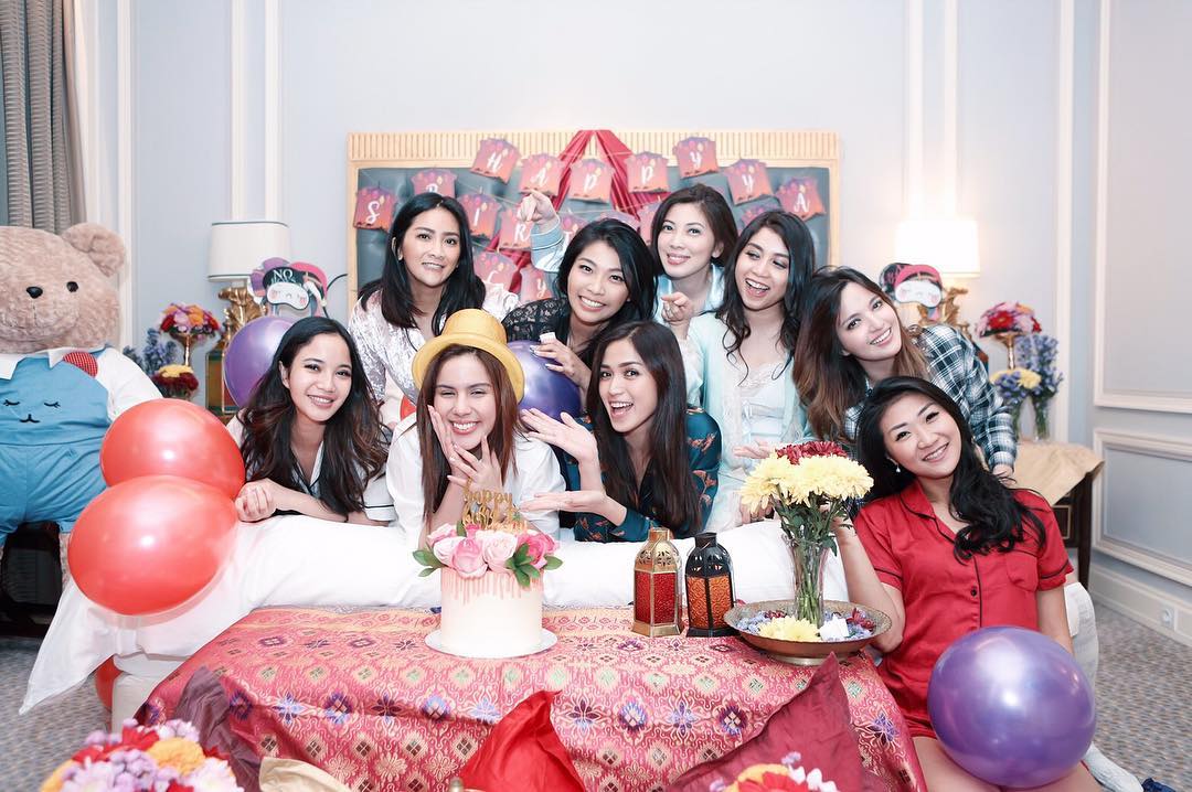 Girl Squad memberikan surprise kepada Sally Adelia di sebuah kamar, nampak Jessica Iskandar dan Nia Ramadhani cs kompak mengenakan baju piyama.