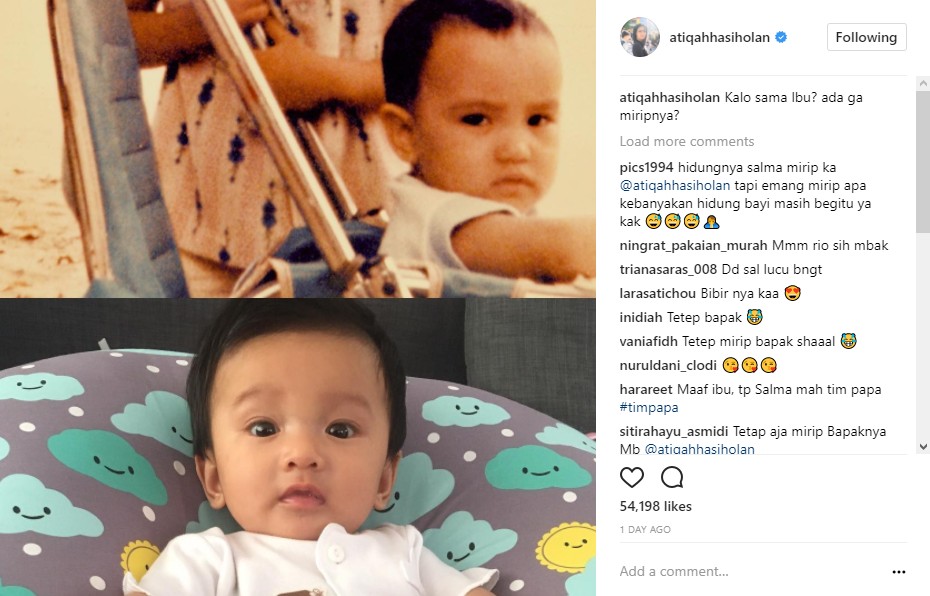 Dengan konsep sama, Atiqah kembali membagikan potret saat dirinya bayi disejajarkan dengan foto Salma. Wanita 35 tahun itu pun meminta pendapat pada pengikutnya soal kemiripan wajahnya dan sang putri. "Kalo sama Ibu? ada ga miripnya?" lanjut Atiqah.