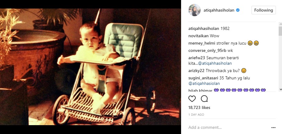 Seolah tak menyerah, Atiqah pun mengunggah foto dirinya saat bayi. Dalam foto itu, tampak Atiqah kecil duduk di troley. Keterangan foto itu menyebutkan bahwa potret masa kecil Atiqah diambil sekitar tahun 1982.
