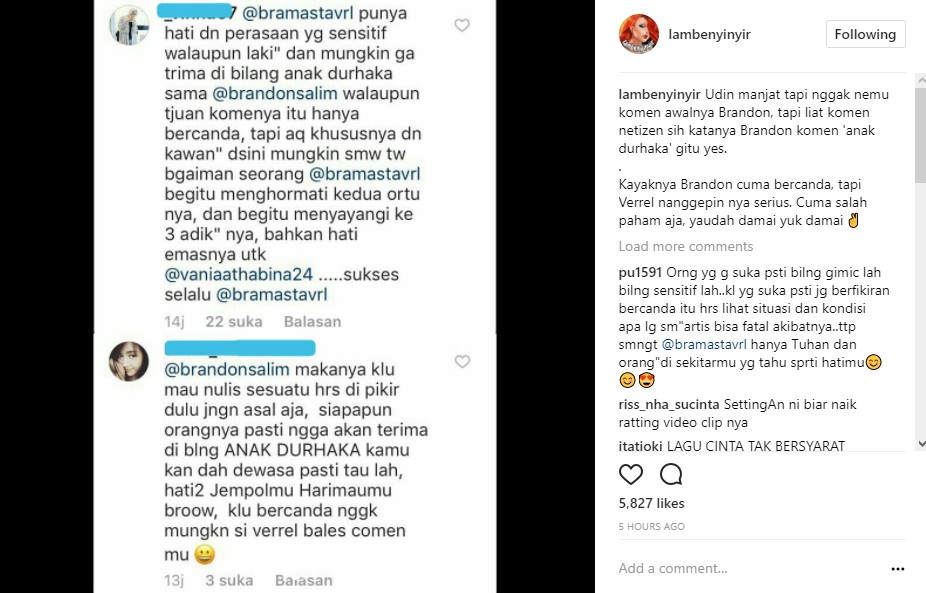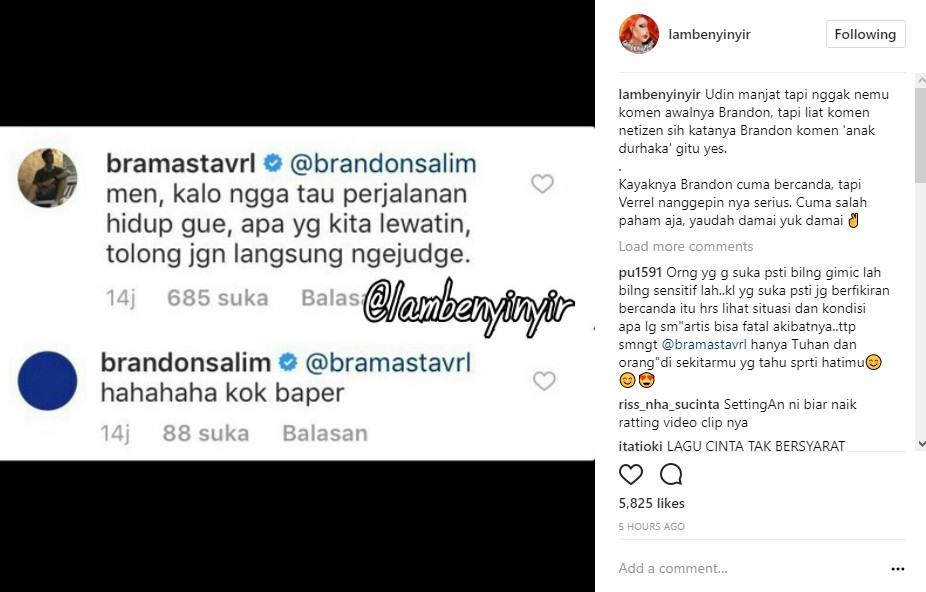 Sementara itu, Brandon sebagai sang pencetus komentar pun menanggapi pernyataan Verrell. "@bramastavrl Hahahaha kok baper," balas Brandon dikutip dari postingan akun gosip @lambenyinyir.