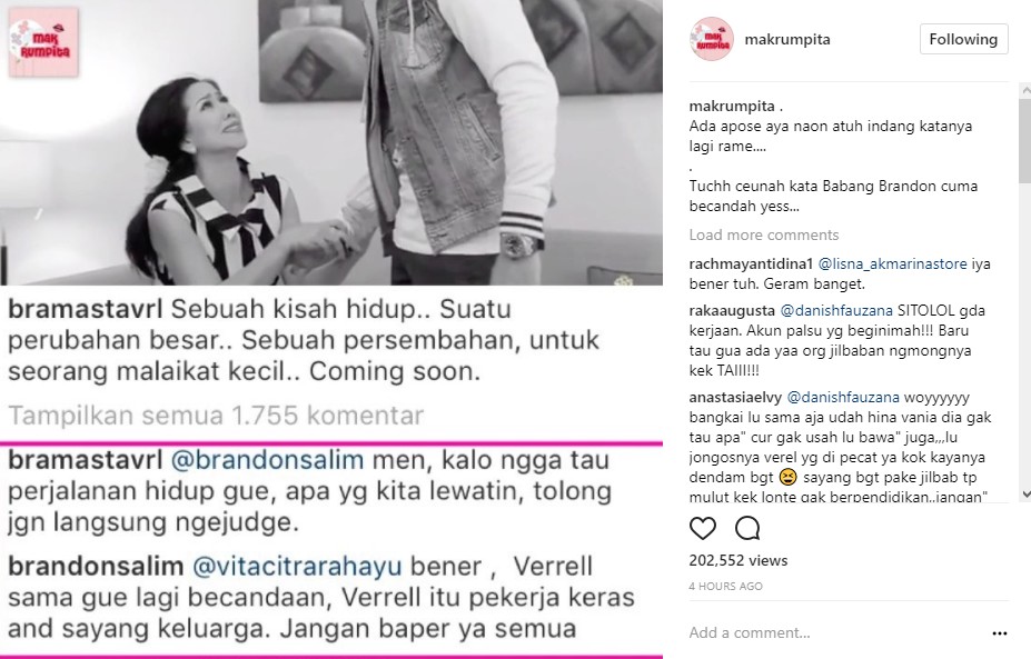 Bukan hanya soal tayangan mengharukan itu, netizen juga dihebohkan dengan komentar Brandon Nicholas Salim yang tampaknya menyinggung hati Verrell. Soal singgungan Brandon kepadanya, Verrell refleks memberi peringatan pada sahabatnya itu. "@brandonsalim men, kalo ngga tau perjalanan hidup gue, apa yg kita lewatin, tolong jgn langsung ngejudge," ungkap Verrell.
