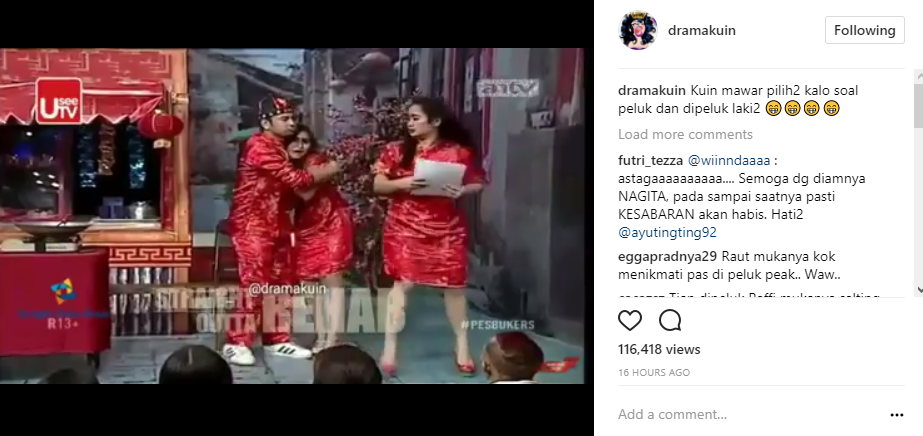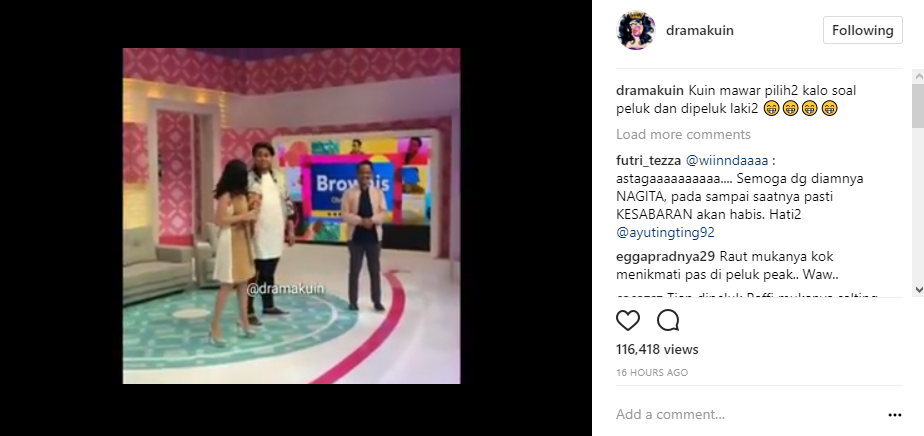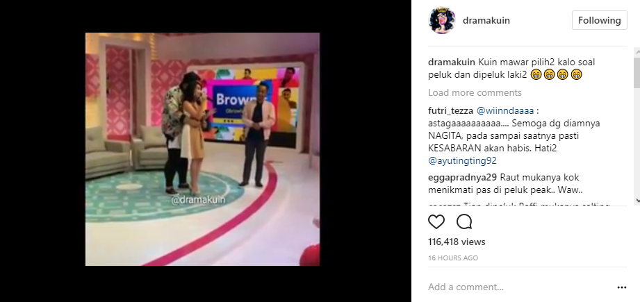 Di sisi lain, akun @dramakuin juga menayangkan video lama yang menampilkan aksi Ayu Ting Ting dan Raffi Ahmad saat berpelukan. Berbeda dengan aksi Ayu Ting Ting pada Igun, pelantun "Kamu Kamu Kamu" itu justru terlihat lebih nyaman. "Kuin mawar pilih2 kalo soal peluk dan dipeluk laki2," tulis akun @dramakuin dalam keterangan postingannya.