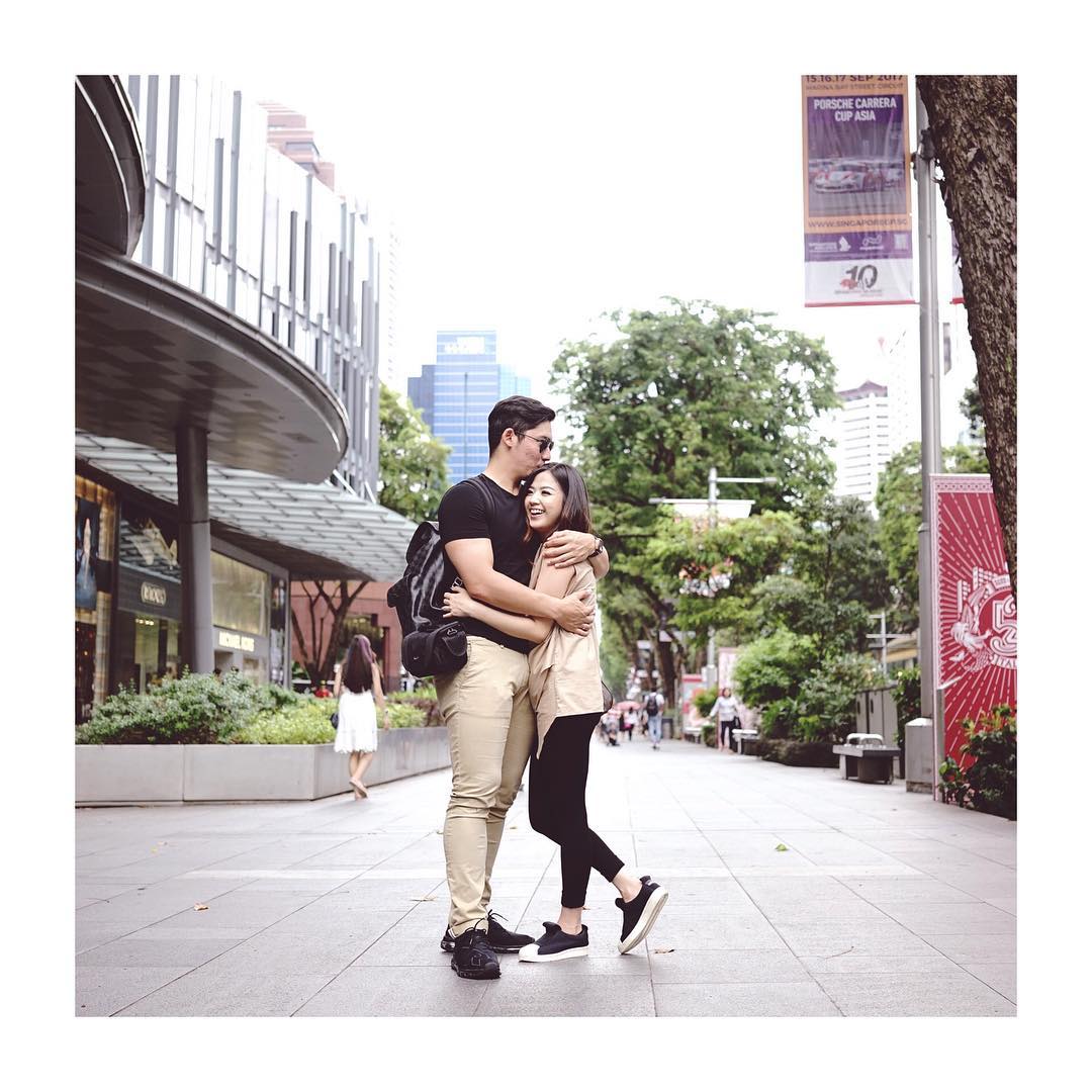 Keduanya memang kerapkali membagikan momen mesra saat jalan-jalan, salah satunya pelukan sambil menikmati pemandangan kawasan kota Singapura ini.