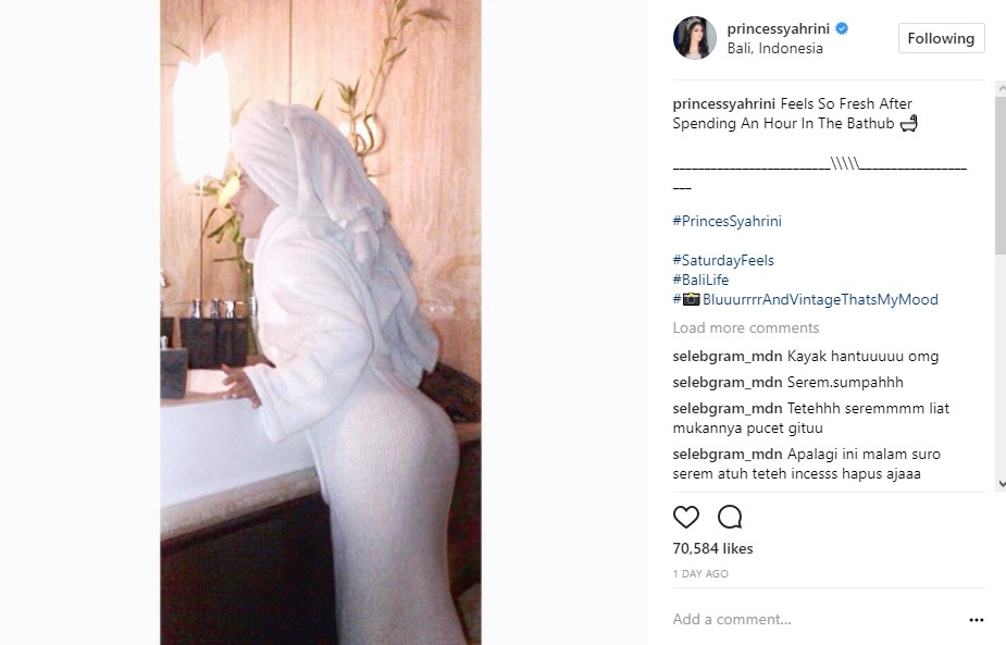 "Njir awalnya gw kira pocong !!! Ternyata syahrini," ujar @afr***l1088. "Muka sama tangan kok ga singkron mami @princessyahrini," kata @laa_***la. "Tetehhh seremmmm liat mukannya pucet gituu," imbuh akun @sel***ram_mdn.