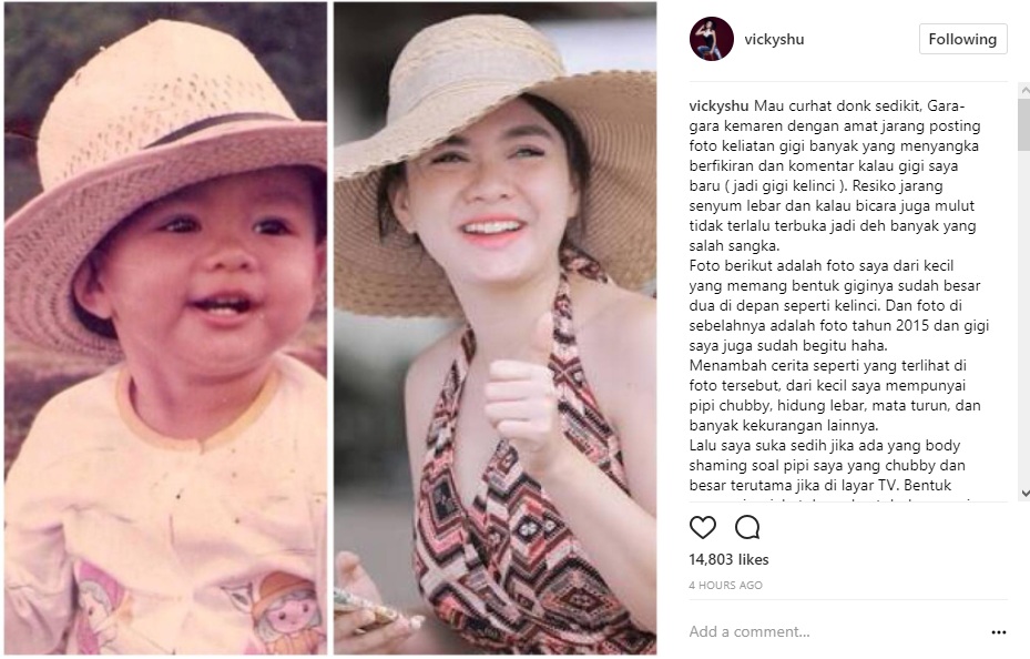 Lebih lanjut, ia pun menyertakan foto masa kecil dan potret tahun 2015 silam dengan senyum lebar. "Foto berikut adalah foto saya dari kecil yang memang bentuk giginya sudah besar dua di depan seperti kelinci. Dan foto di sebelahnya adalah foto tahun 2015 dan gigi saya juga sudah begitu haha," imbuh Vicky.