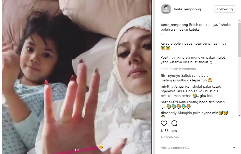 Mengetahui hal tersebut, netizen pun heboh. Terlebih saat akun @tante_rempoong mempertanyaakan keabsahan soal kuteks yang digunakan Mulan. Seperti diketahui, kuteks tak boleh digunakan saat salat. "Boleh donk tanya, " sholat boleh g sih pakai kuteks?" Kalau g boleh, gagal total pencitraan nya Positif thinking aja mungkin pakai inglot yang katanya bisa buat sholat," tulis akun tersebut dalam keterangan postingannya.