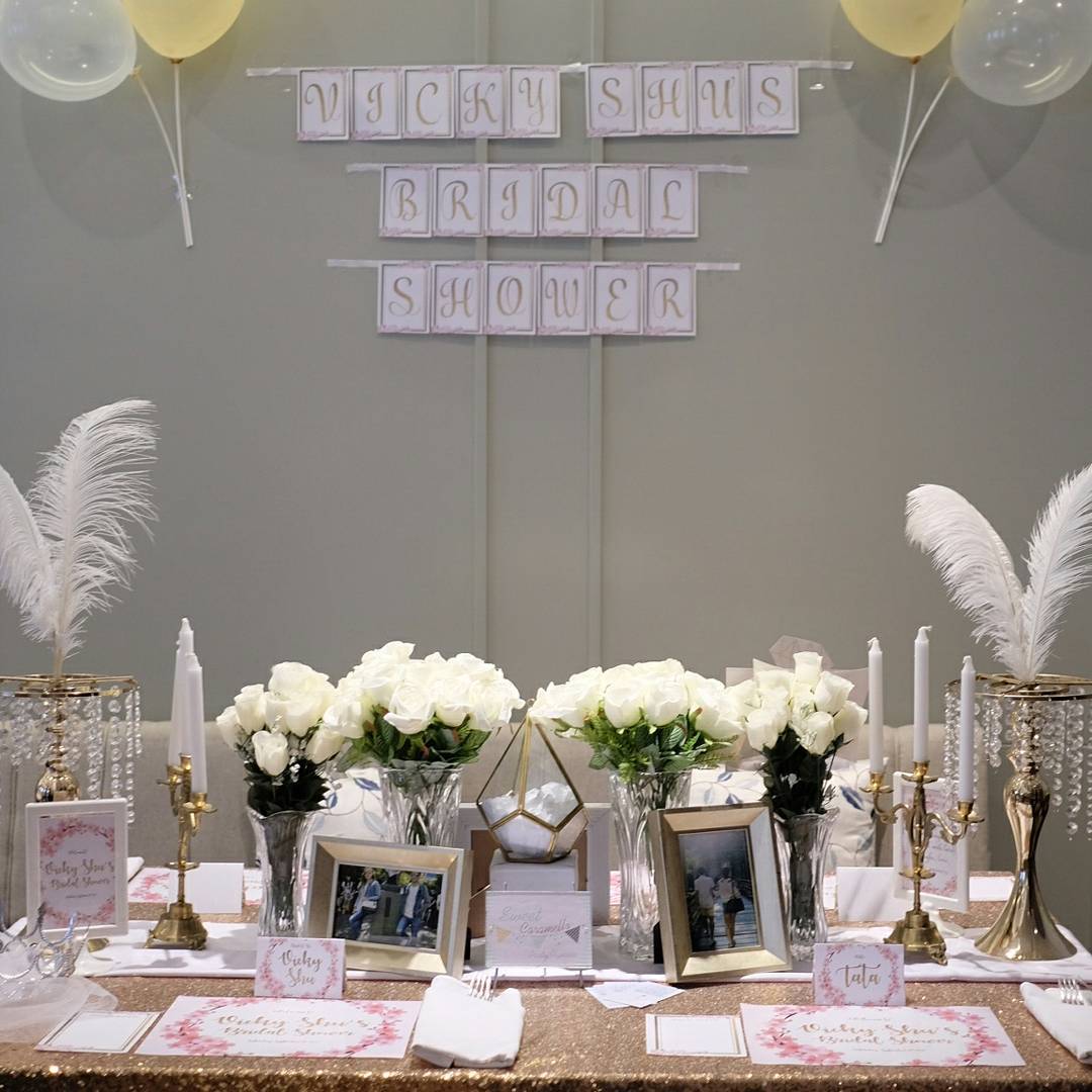 Bunting flag bertuliskan "Bridal Shower Vicky Shu" pun tergantung rapi di tembok cafe itu lengkap dengan foto kebersamaannya dengan calon suami.
