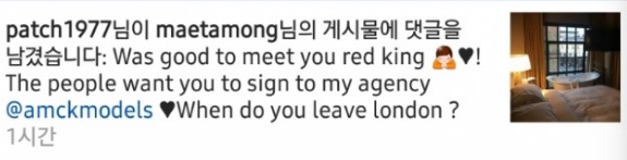 Selanjutnya, Patrick juga dikabarkan mulai mengikuti (follow) akun Instagram Lee Seung Hoon. Bahkan, pria itu juga sempat meninggalkan komentar dalam salah satu postingan Lee Seung Hoon yang berbunyi, "Senang sekali bisa bertemu denganmu, Red King! Orang-orang ingin agar kau membuat kontrak dengan agensiku @amckmodels. Kapan kau akan meninggalkan London?"