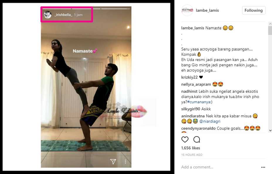 Melalui postingan akun gosip @lambe_lamis, terlihat Irish Bella berdiri tegak bertumpu di paha Giorgino Abraham. Tak hanya itu, telapak tangan Irish Bella tampak menyatu sama lain seolah memberi salam. "Namaste," tulis mantan kekasih Rezky Aditya itu dalam keterangan postingannya.