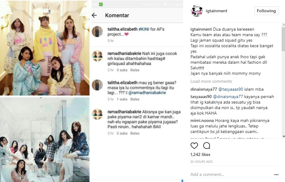 Namun, siapa sangka Nia merasa aksi serunya bersama gengnya itu dinilai telah ditiru. Melalui postingan akun @talitha.elizabeth, seorang profesional dancer, terlihat potret beberapa wanita mengenakan piyama dengan warna cerah. Mengetahui postingan tersebut, Nia pun menyarankan pada penari itu untuk menambahkan tagar #girlsquad.