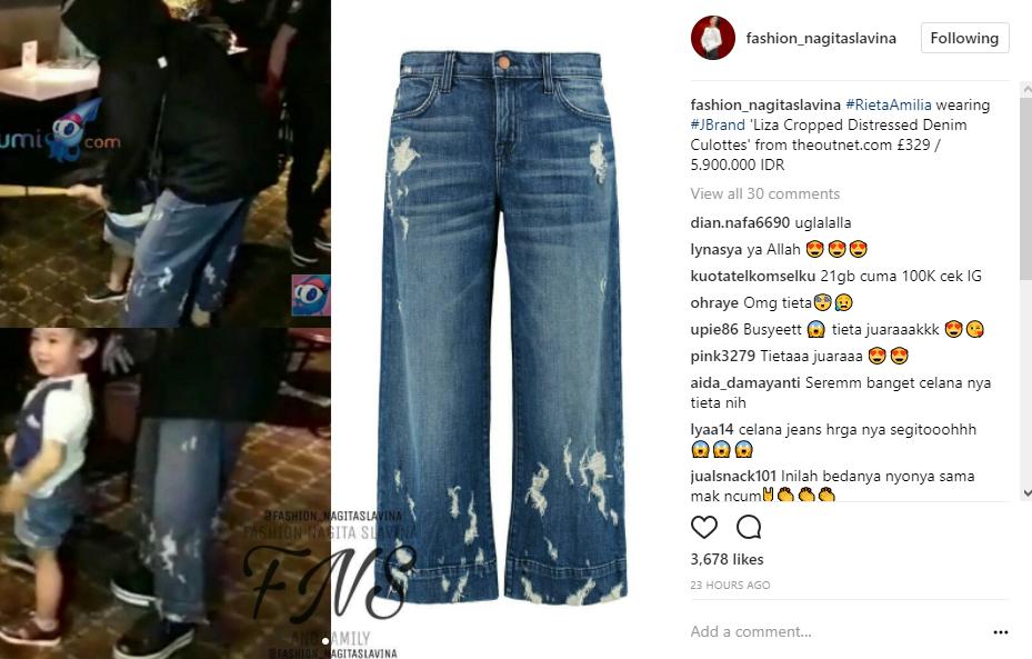 Meskipun memiliki model sederhana, siapa sangka harganya sukses membuat netizen syok. Bagaimana tidak, celana itu dibandrol dengan harga hampir mencapai Rp 6 juta. "#RietaAmilia wearing #JBrand 'Liza Cropped Distressed Denim Culottes' from theoutnet.com £329 / 5.900.000 IDR," tulis akun @fashion_nagitaslavina dalam keterangan postingannya.