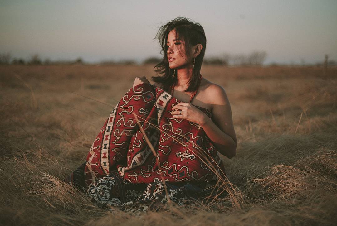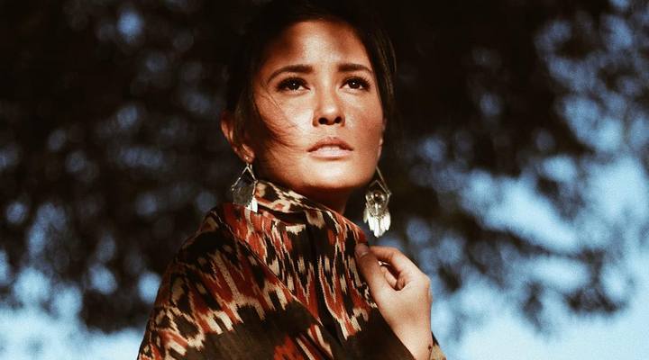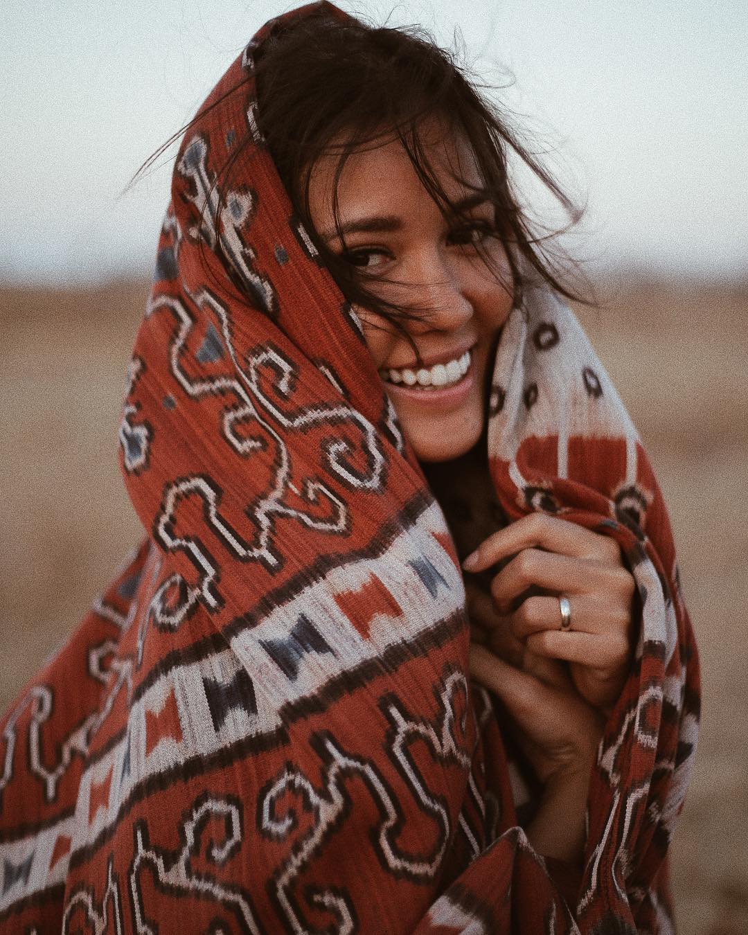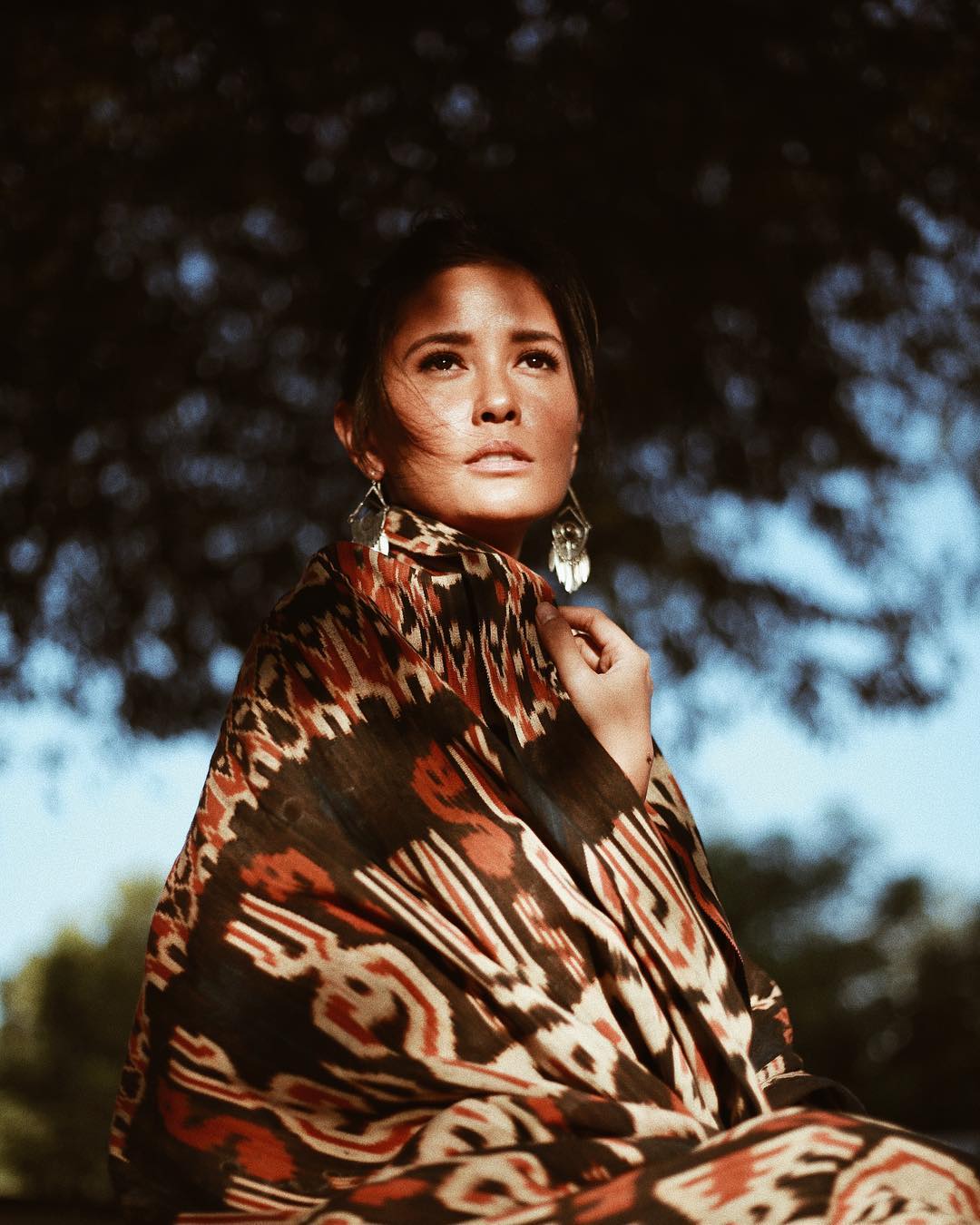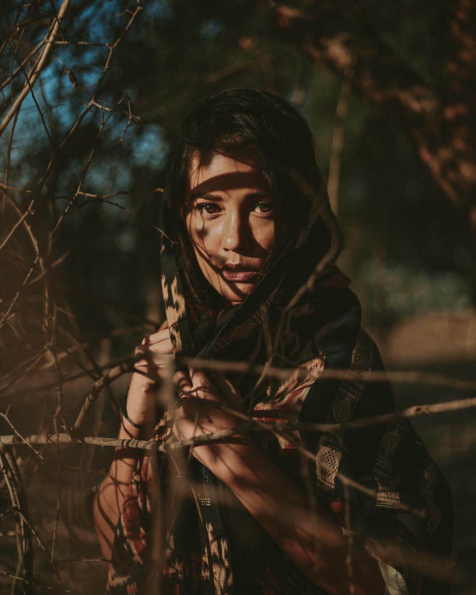 Istri Adrianto Djokosoetono itu kemudian berpose menghadap ke matahari terbenam. Ia cantik dengan mengenakan balutan kain tenun khas daerah Sumba.