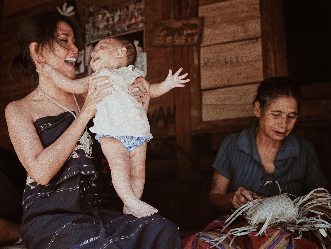 Selain belajar menenun, dirinya juga berinteraksi dengan para penduduk lokal bahkan menggendong salah satu bocah kecil yang ada di Kampung Tarung, Sumba Barat.