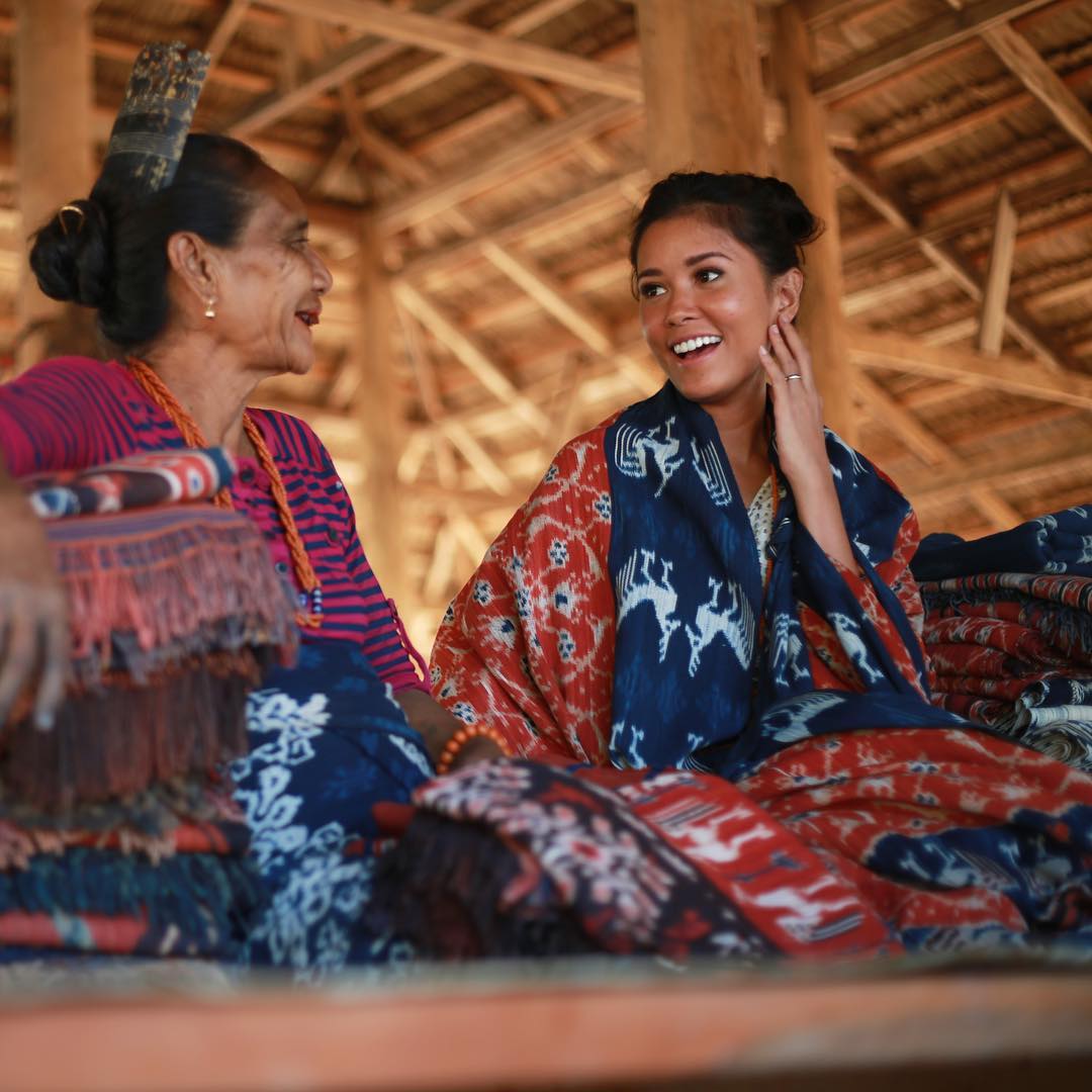 Selain berfoto, Titi juga belajar dengan penduduk lokal dalam menenun kain tenun lho.