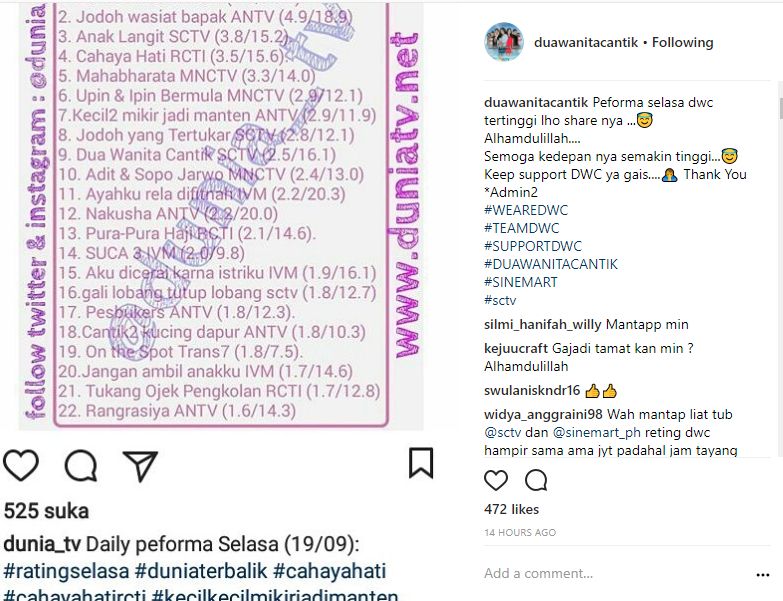 Kabar ini diunggah oleh salah satu fanbase "Dua Wanita Cantik" di Instagram. Admin dari akun tersebut memberikan data peringkat yang memperlihatkan "Dua Wanita Cantik" berada di posisi 9 di bawah Jodoh yang Tertukar dengan rating 2.5 dan share 16.1%.
