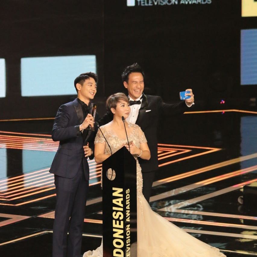 Indy Barends dan Daniel Mananta sebagai presenter ITA 2017 tak sungkan-sungkan untuk berselfie bersama Minho saat di atas panggung.