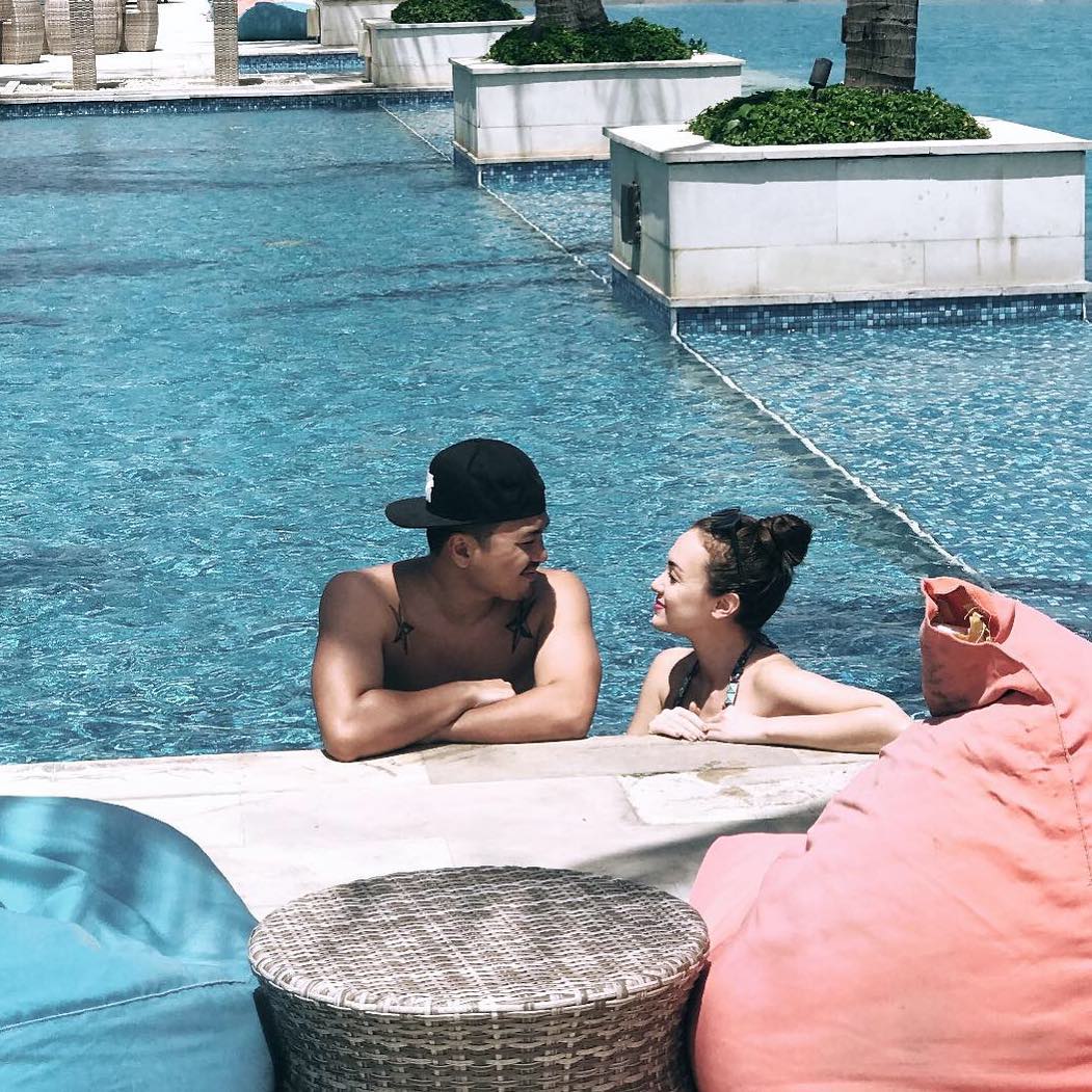 Manisnya, ini lho kegiatan Rianti Crathwright saat liburan. Renang bareng Cas Alfonso Nainggolan, sang suami di Vue Beach Club, Bali.