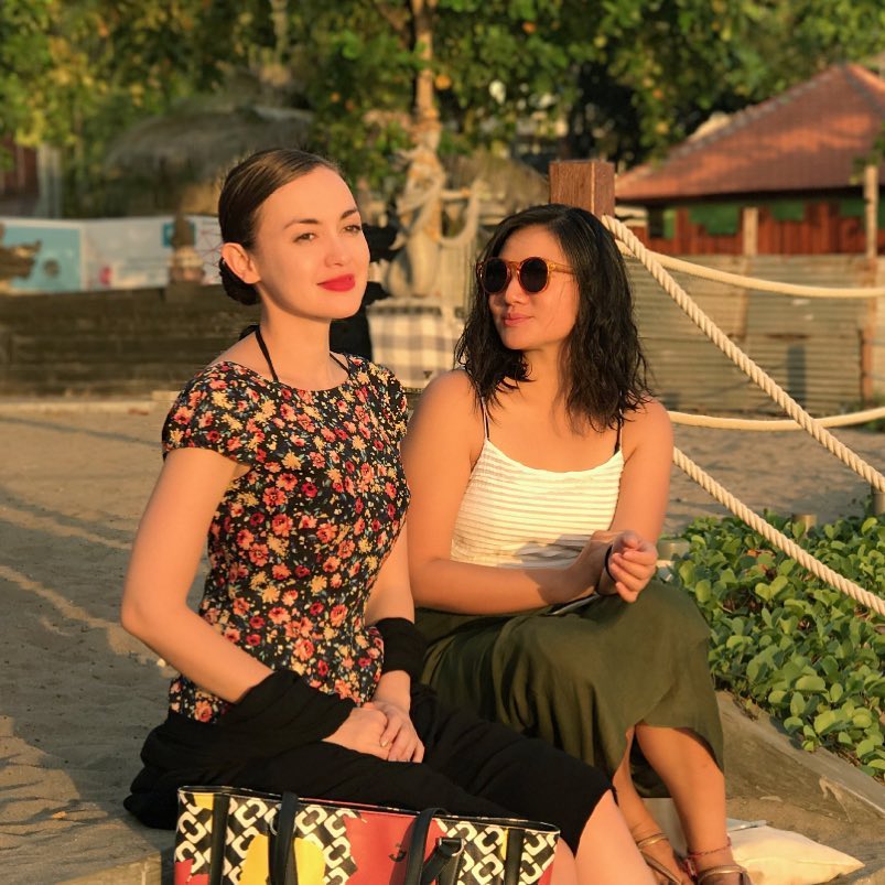 Bersama Evie, sang sahabat, wanita 33 tahun ini menantikan golden hour sunset di salah satu kawasan Bali.