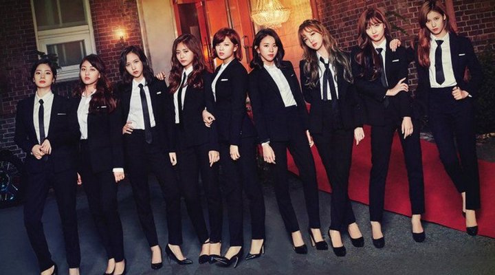 Dalam balutan setelan seksi hitam, kesembilan member Twice berpose didepan 'Mansion' mereka.