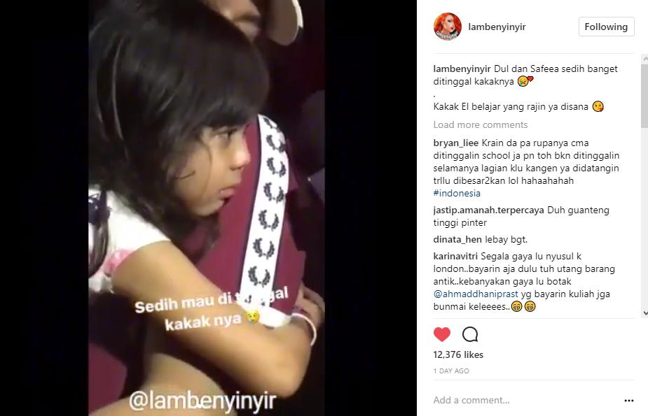 Bukan hanya Dul Jaelani, rupanya putri sulung Ahmad Dhani buah pernikahannya dengan Mulan Jameela, Safeea ikut menangis di gendongan El. Seolah tak ingin melepas kepergian kakaknya itu, Safeea tampak memberikan pelukan erat. Untuk menghentikan tangis anaknya itu, Ahmad Dhani pun memberi iming-iming untuk sekolah ke London bersama El Rumi. Layaknya anak kecil lainnya, Safeea pun menjawabnya dengan anggukan polosnya.