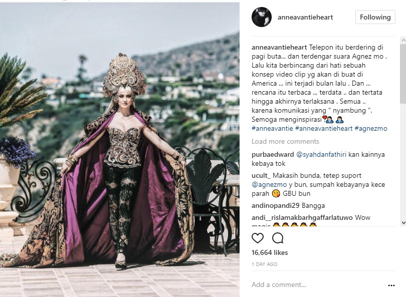 Sementara itu, soal busana yang digunakan Agnes, rupanya tak terlepas sentuhan seorang desainer ternama Tanah Air, Anne Avantie. Sekitar bulan lalu, pembicaraan soal konsep video klip terbaru Agnes pun ternyata sudah terjadi. "Telepon itu berdering di pagi buta... dan terdengar suara Agnez mo . Lalu kita berbincang dari hati sebuah konsep video clip yg akan di buat di America .., ini terjadi bulan lalu . Dan ... rencana itu terbaca .., terdata .. dan tertata hingga akhirnya terlaksana . Semua .. karena komunikasi yang " nyambung ". Semoga menginspirasi," tulis Anne dalam keterangan postingannya di Instagram beberapa waktu lalu.