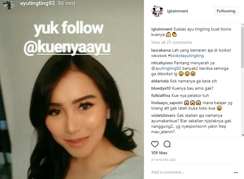 "#boikotayutingting #boikotayutingting #boikotayutingting," ujar @hi***sc**ff. "Kuenya japok eh kuenya gundik. Eh kuenya ayu deng," kata @r***mayditasharma. "#boikotkuenyaayu #boikotayutingting92 #boikotayutingting Siap2 bau amisss siap2 makan kue ayu kena guna2 gresek2 laki org...." imbuh @***reen009.