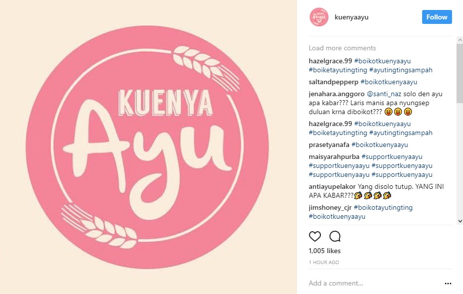 Alih-alih terima dukungan, Ayu Ting Ting malah kembali menuai cibiran. Belum juga gerai dibuka, komentar pedas yang kebanyakan berisi soal permintaan untuk memboikot Ayu Ting Ting membanjiri laman Instagram akun @kuenyaayu. Padahal, beberapa postingan yang baru diunggah beberapa jam di akun tersebut hanya membagikan potongan logo bisnis kue Ayu Ting Ting.