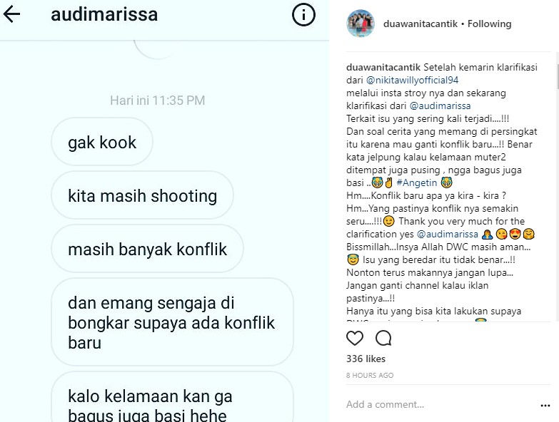 "Setelah kemarin klarifikasi dari @nikitawillyofficial94 melalui insta stroy nya dan sekarang klarifikasi dari @audimarissa," kata admin akun tersebut. "Terkait isu yang sering kali terjadi....!!! Dan soal cerita yang memang di persingkat itu karena mau ganti konflik baru...!! Benar kata jelpung kalau kelamaan muter2 ditempat juga pusing , ngga bagus juga basi ."