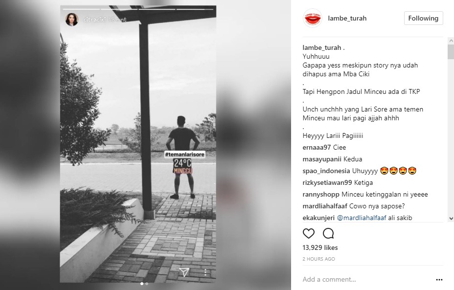 Tak sedikit netizen yang menduga sosok pria misterius itu adalah Ali Syakieb. Mereka menilai, postur tubuh pria yang menemani Ciki lari sore itu mirip dengan Ali.
