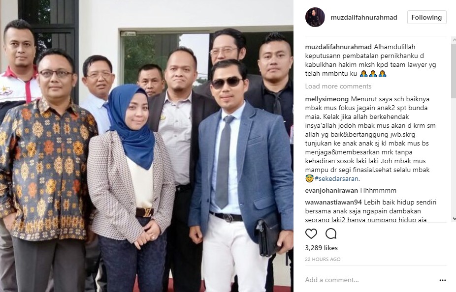 Keputusan yang telah ditetapkan pengadilan itu pun membuat Muzdalifah bersyukur. Ia pun turut berterima kasih pada pihak-pihak yang selama ini telah memberikan bantuan padanya. "Alhamdulillah keputusann pembatalan pernikhanku d kabulkhan hakim mksh kpd team lawyer yg telah mmbntu ku," tulis Muzdalifah melalui postingan di akun Instagram pribadinya.