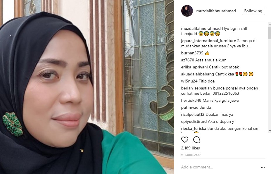 Pasca pembatalan pernikahan telah dikabulkan, Muzdalifah semakin terlihat ceria. Bahkan, tampaknya janda Nassar itu memilih untuk melakukan hal-hal positif. Baru-baru ini, melalui postingannya, Muzdalifah tampak mengajak para pengikut Instagramnya untuk lebih mendekatkan diri pada Sang Pencipta. "Hyu bgnn shlt tahajudd," kata Muzdalifah, Selasa, 26 September.