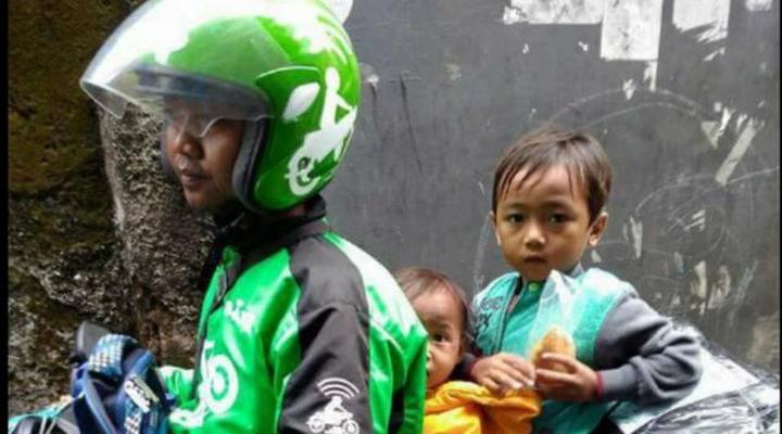 "Istrinya kabur, Abang Gojek ini narik sambil momong anak. Setelah istrinya kabur, Abang Gojek ini tetap narik demi menafkahi kedua anaknya. Namun sekarang dia hanya ngambil orderan Go-Send, antar kirim barang aja, karena dua anaknya selalu dibawa. Karena di kontrakan gak ada yg jaga. Istrinya kabur entah kemana, meninggalkan dua anak yang masih kecil ini. Silahkan #share semoga dimudahkan rejekinya," bunyi keterangan akun tersebut.