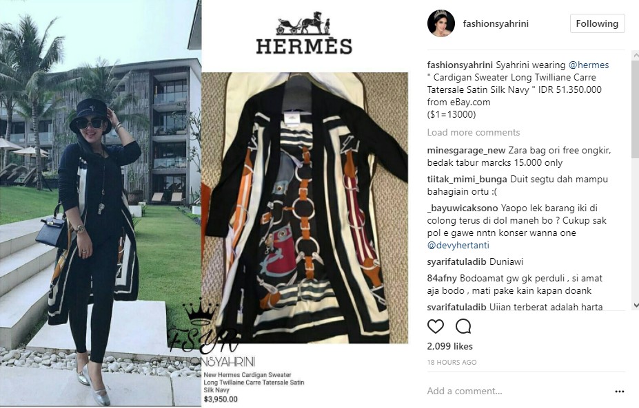 Siapa sangka, cardigan dengan model sederhana itu dibandrol dengan harga yang sangat mahal. Menurut keterangan akun @fashionsyahrini, untuk satu cardigan, harganya mencapai Rp 50 jutaan. "Syahrini wearing @hermes " Cardigan Sweater Long Twilliane Carre Tatersale Satin Silk Navy " IDR 51.350.000 from eBay.com ($1=13000)," tulis akun tersebut dalam keterangan postingannya.