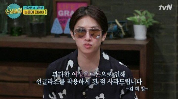 "Jadi aku menangis hampir satu jam lamanya," tambah Heechul bercerita. "Kurasa hormon wanita ini bertambah banyak ketika usiamu semakin bertambah tua," pungkasnya kocak sehingga membuat semua penonton dan MC acara tertawa terpingkal-pingkal. Melihat pengakuan kocak Heechul itu, Oh Hyun Kyung langsung menggodanya dengan berkata, "Oh, kukira apakah kamu baru saja melakukan operasi kelopak mata?".
