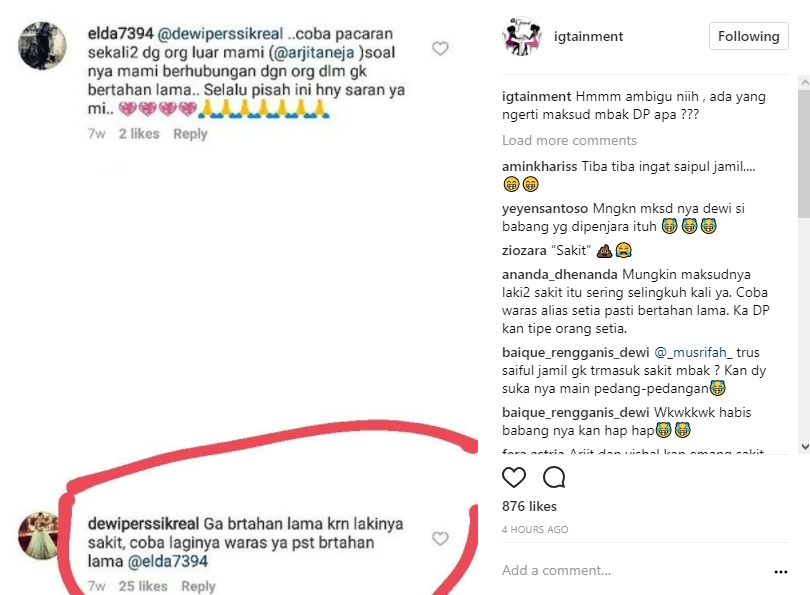 Dalam postingan yang diunggah ulang oleh akun gosip @igtainment, tampak seorang penggemar memberi saran pada Depe untuk mencari kekasih yang berasal dari luar negeri, seperti Arjit Taneja. Ada alasan tersendiri mengapa seorang fans itu memberi saran itu pada sang idola. Menurutnya, Depe kerap gagal saat membina rumah tangga dengan seorang pria yang berasal dari dalam negeri.