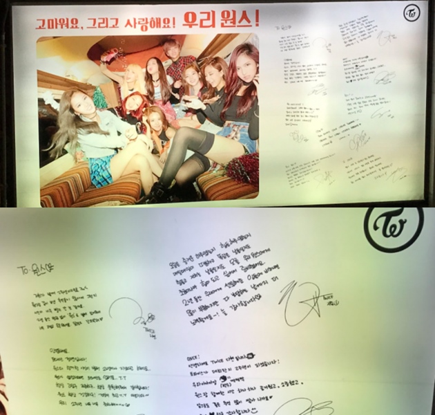 Bukan melalui video maupun tulisan di dunia maya, tapi Twice menyewa sebuah papan iklan besar di stasiun kereta bawah tanah untuk mengungkapkan rasa terima kasih mereka. "Terima kasih, dan kami sangat mencintai kalian! Once!" begitu bunyi tulisan besar di bagian atas papan iklan tersebut.