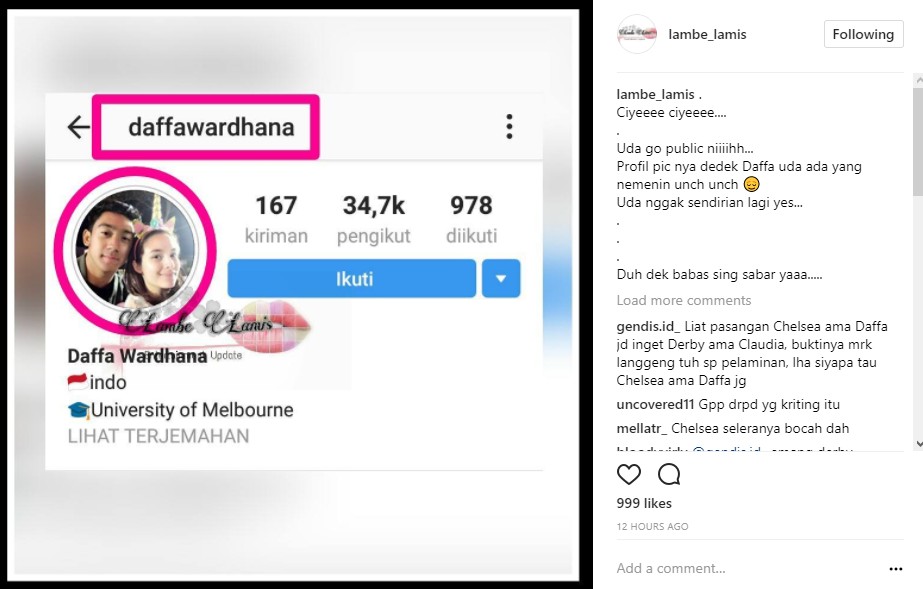 Postingan yang diunggah akun gosip @lambe_lamis itu pun menuai berbagai komentar netizen. Bahkan, tak sedikit netizen yang mendukung hubungan Daffa dan Chelsea. Mereka juga tampak bersyukur karena Chelsea ternyata tak menjalin hubungan asmara dengan Bastian.