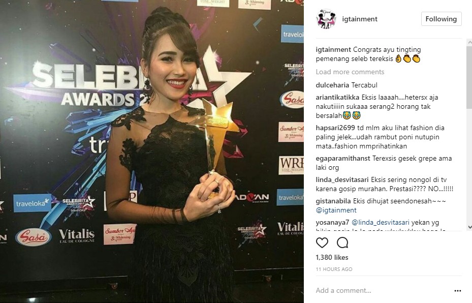 Melalui postingan akun gosip @igtainment, tampak Ayu Ting Ting tengah memegang piala berbentuk bintang. Ayu Ting Ting tampak menggenggam piala berwarna emas itu di bagian bawahnya. "Congrats ayu tingting pemenang seleb tereksis," tulis akun gosip itu dalam keterangan postingannya.