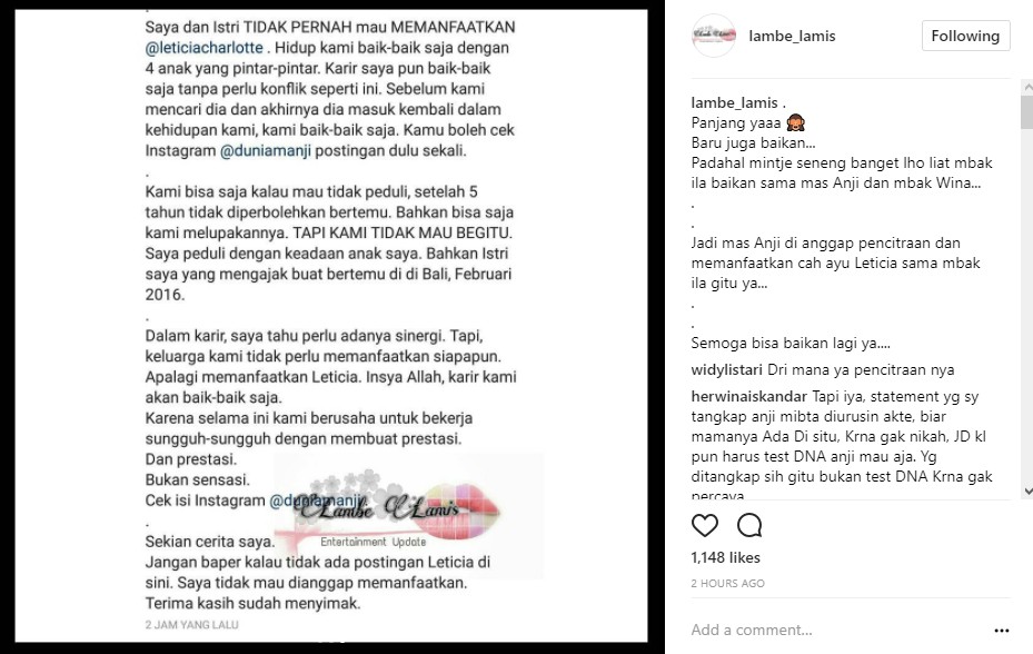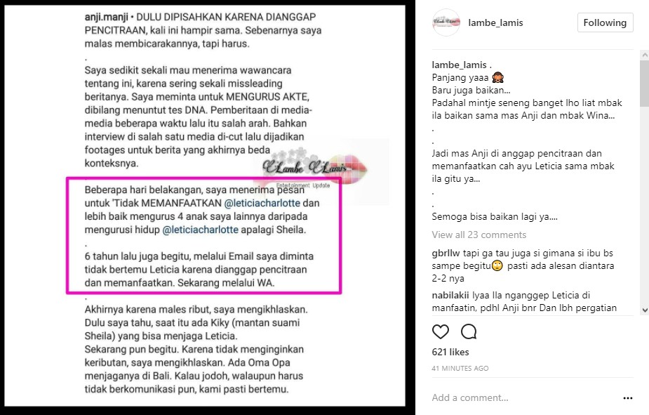 Di sisi lain, beberapa hari ini Anji menerima pesan yang berisi untuk tak lagi ikut campur dalam kehidupan Leticia dan Sheila. "Beberapa hari belakangan, saya menerima pesan untuk 'TIDAK MEMANFAATKAN @leticiacharlotte dan lebih baik mengurus 4 anak saya lainnya daripada mengurusi hidup Ticia apalagi Sheila," tutur anji.